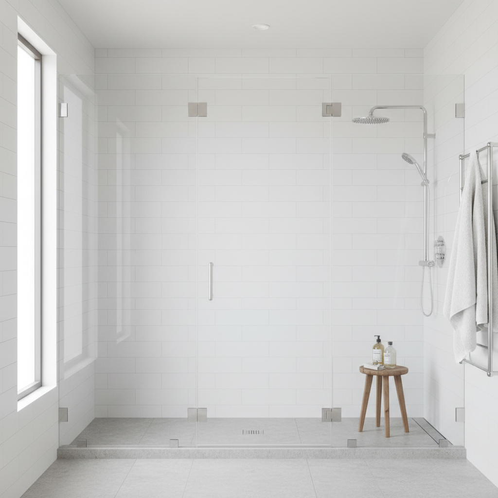 Choose between frameless, semi-frameless, and framed enclosure styles. We help select glass thickness, finish (clear, frosted, rain), and hardware finish (chrome, brushed nickel, matte black).